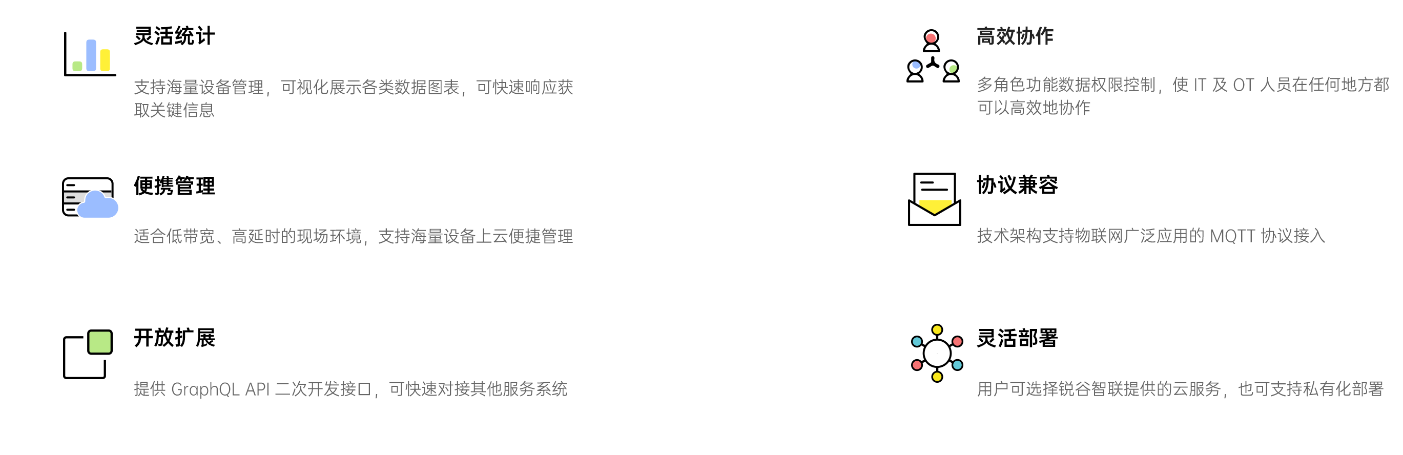 GoDevice 設(shè)備云平臺(tái)是由銳谷智聯(lián)自主研發(fā),集批量管理,設(shè)備監(jiān)控,遠(yuǎn)程升級(jí)等功能于一體的新一代集中式設(shè)備管理平臺(tái),您可以在任何時(shí)間任何地點(diǎn)通過 GoDevice 設(shè)備云平臺(tái)管理成千上萬的銳谷智聯(lián)設(shè)備。通過可視化的用戶界面 和簡易的使用流程,使您可以方便的管理和監(jiān)視銳谷智聯(lián)的數(shù)傳終端、工業(yè)路由器及工業(yè)網(wǎng)關(guān)等硬件設(shè)備,實(shí)現(xiàn)設(shè)備快速集成、海量設(shè)備一鍵管理。私有化部署模式,保證用戶數(shù)據(jù)安全性;云端部署模式滿足用完即走的輕松體驗(yàn),讓您專注自己的核心業(yè)務(wù),為您的企業(yè)發(fā)展賦能。